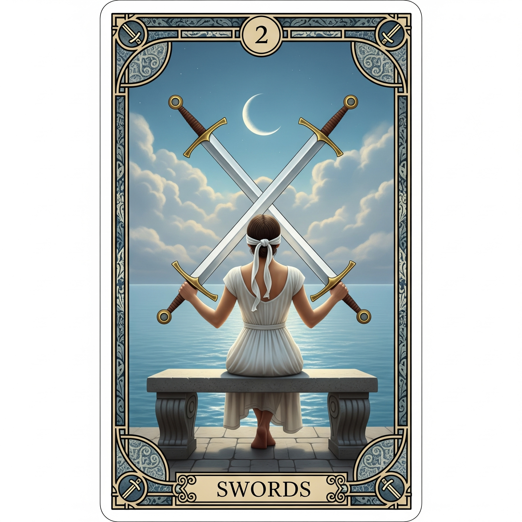 소드 2번은 방어적인 태도, 감정의 억제, 선택의 망설임을 상징합니다.