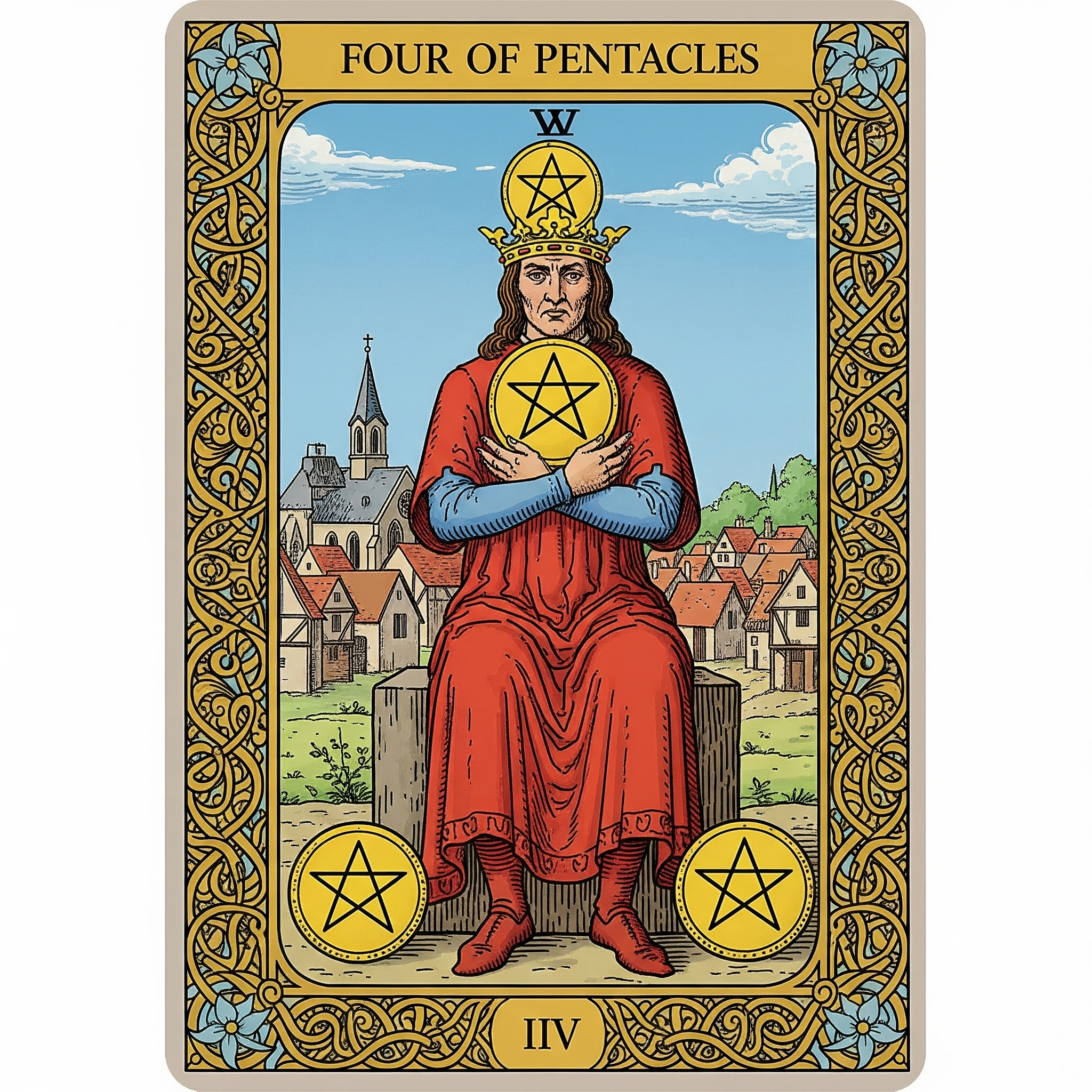 펜타클 4번은 자신의 자산을 꽉 움켜쥔 인물을 그린 카드로, 현재 가진 것을 지키려는 성향이 강합니다.