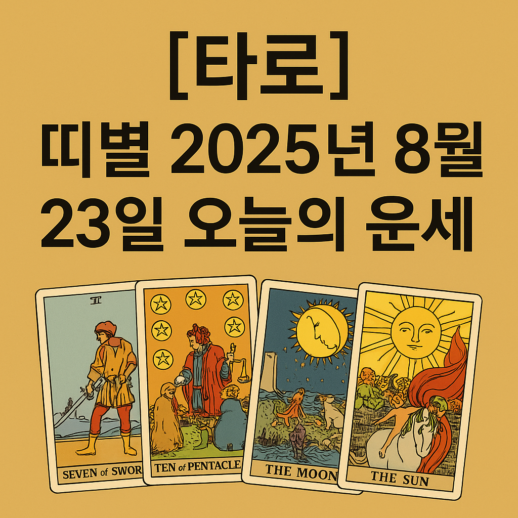 안녕하세요! 오늘도 타로카드가 전해주는 메시지와 함께 하루를 시작해 보세요. 2025년 8월 23일, 띠별로 어떤 기운이 흐르고 있을까요? 연애·재물·직장·건강 네 가지 측면으로 나누어 카드의 의미를 전합니다.