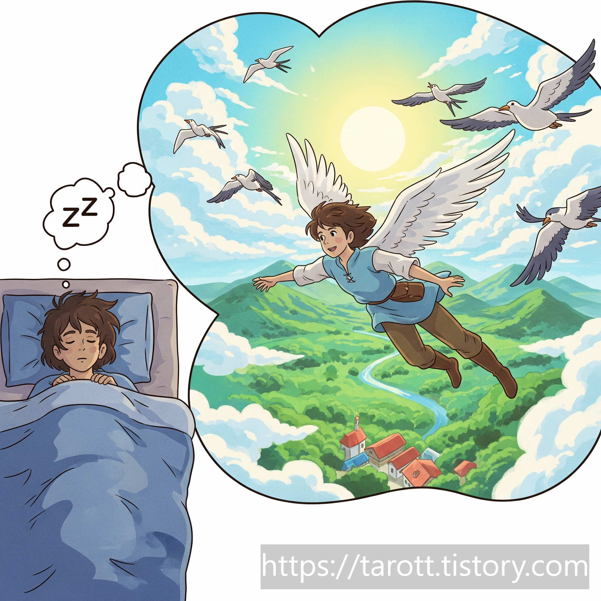하늘을 나는 꿈은 전반적으로 길몽이며, 새로운 기회, 성취, 자유를 의미합니다. 다만 날다가 추락하는 꿈은 경계의 메시지를 담고 있으니, 현재 삶의 준비 상황을 점검해야 합니다.